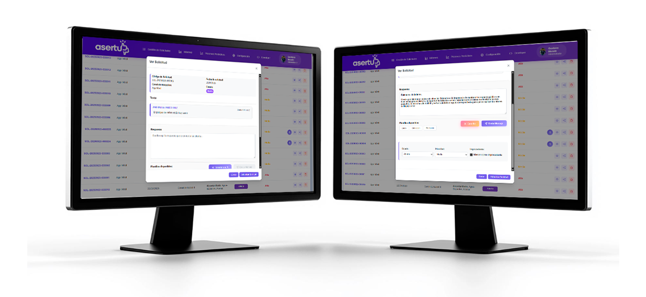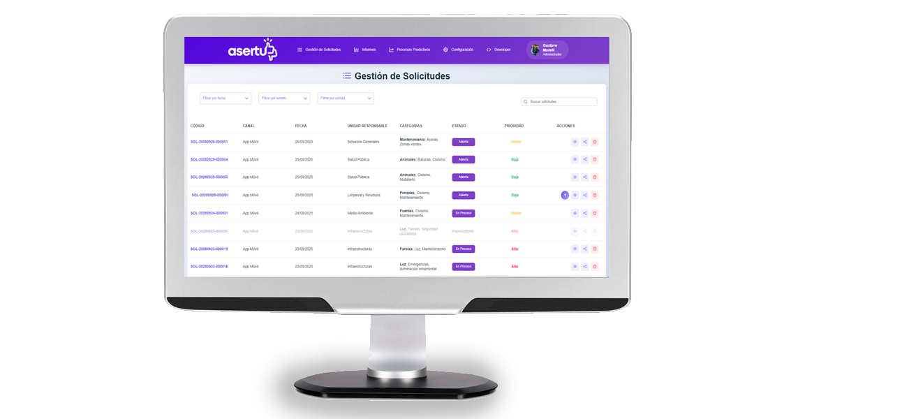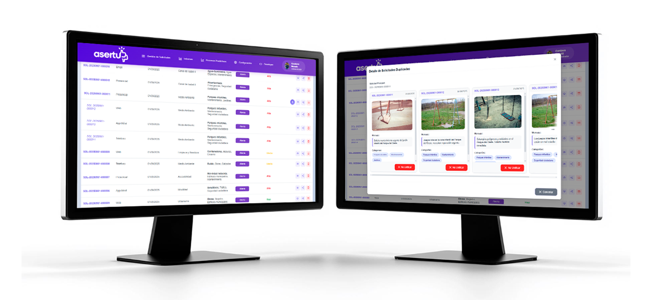 El backend de Asertu incluye un sistema inteligente que optimiza la gestión al identificar incidencias repetidas y destacar lo más urgente.