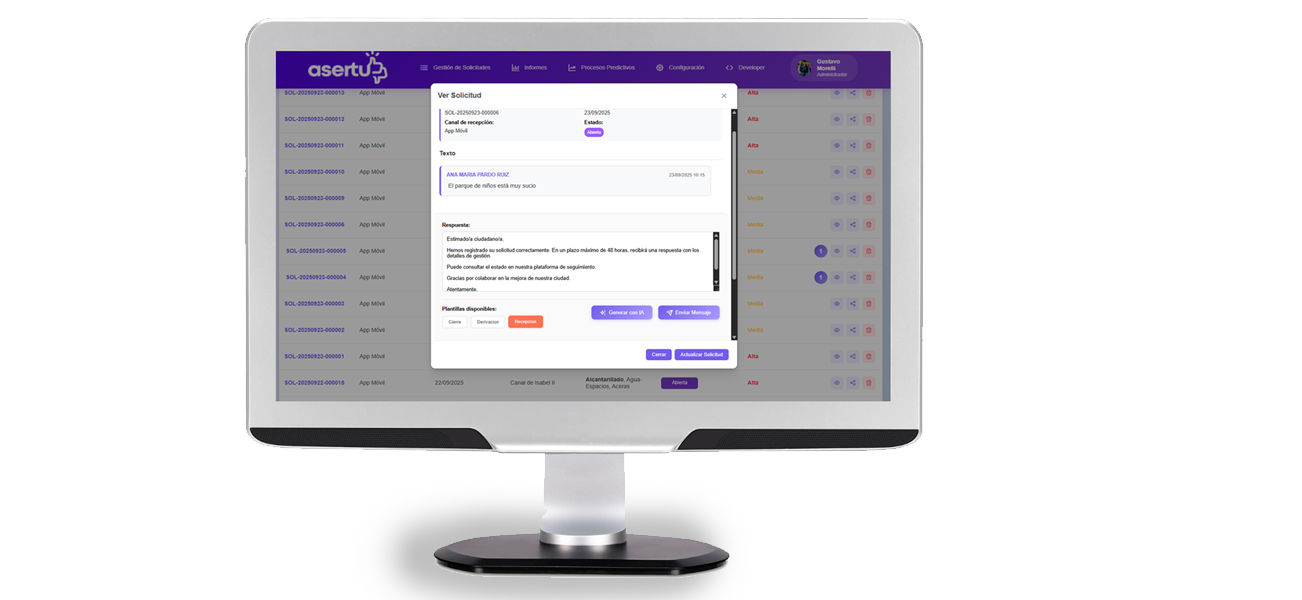 Se incorpora un sistema de plantillas que facilita la comunicación con ciudadanos y clientes, garantizando agilidad y coherencia en cada interacción.